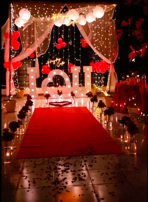 10 Series Lights “Happy Valentine’s Day” Letter Banner 10 Heart-Shaped Foil Balloons 25 Red & White Balloons (Floor Decoration) 25 Red & White Balloons (Wall Setup / Backdrop Decoration) 2 Balloon Pillars (20 Balloons Each) 10 ft Red Carpet 3 kg Rose Petals Heart Shape Made with Rose Petals on the Floor (Spread Over Red Carpet) 1 Fairy Light (Floor Setup) “I ❤️ U” LED Light (Subject to availability ) 10 Rose Bouquets (3 Roses Each) with Glass Vase 7 x 2 ft White or Red Net Fabric (Total 5 Pieces) 4 Metal Frame Square Structures (Note - Below Items are not included ) Table , Plants , Glass Crockery , Tree , Star light Booking person has to arrange electric point or extension bord to light up 10 series