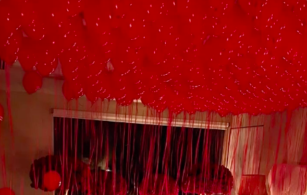 Happy Valentines Day Foil or Forever and always foil Depends on availability 1 Love Letter Foil Balloon 3 Red heart shape ballon Bouquet (3 ballon each ) 200 Red Balloons on Ceiling with Hanging Ribbons and 5 roses Rose Petals Scattered on Floor 10 kg First Latter of both inside Heart with Rose Petals on Floor or bed (NOTE - ROSE BOUQUET NOT INCLUDED )