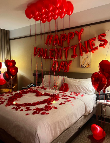 Happy Valentines Day Foil or Forever and always foil Depends on availability 1 Love Letter Foil Balloon 10 Red heart shape Hilum ballon 50 Red Balloons on Ceiling with Hanging Ribbons and 5 roses Rose Petals Scattered on Floor 3kg First Latter of both inside Heart with Rose Petals on Floor or bed 50 Tea Candles