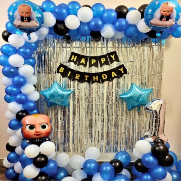 • Balloon arch on backdrop with 150 balloons (70 pastel, 80 balloons)
