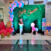 - Green backdrop decorated with 180 balloons (5 confetti balloons, 10 chrome balloons, 165 pastel balloons)