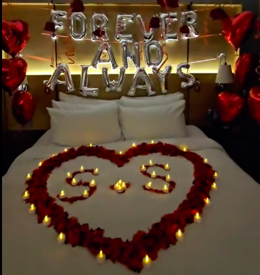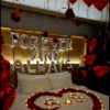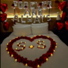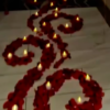 - First Latter of both inside Heart with Rose Petals on Floor or bed
